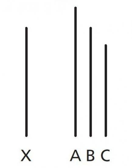 Этот эксперимент в начале 50-х годов прошлого века провёл американский психолог Соломон Эш. Испытуемому показывали два листа, на одном из которых были изображены три линии, а на другой - одна. От испытуемого требовалось определить, какая из линий, нарисованных вместе, равна по длине линии, нарисованной отдельно. Казалось бы, простенькая задача, если бы не одно «но»: прежде чем дать очевидный ответ, испытуемый должен был выслушать ответы других испытуемых…