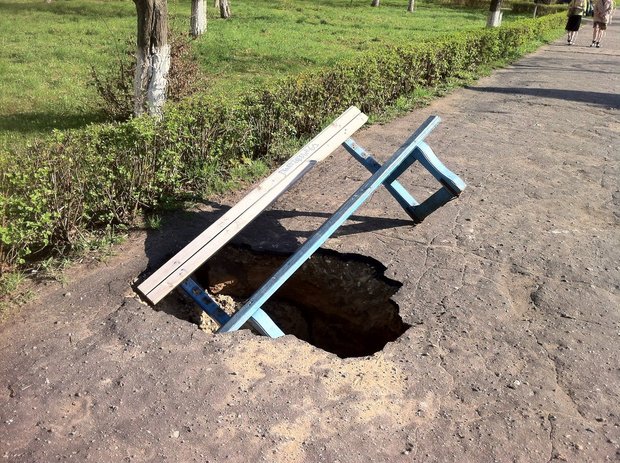 Вместо того, чтобы заделать выбоины, в них просто положили дверные рамы и поломанные скамейки. Видимо, таким образом коммунальные службы хотели «обозначить» опасные места для пешеходов.