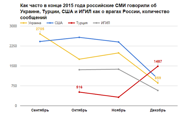 Но подчеркивается, что после 24 ноября, когда Турция сбила российский бомбардировщик Су-24, на федеральных каналах и в интернете у российских пользователей появился новый враг. Если раньше Турцию в контексте терроризма упоминали примерно 20 раз в неделю, то после 24 ноября количество сообщений "Турция, терроризм" увеличилось до полутора сотен. После этой даты телевидение впервые начало называть Турцию "спонсором ИГИЛ".