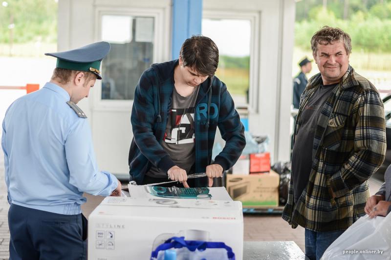 Молодечненцы в бусике, видно, закупились техникой — водитель по очереди достает из багажника пылесос, кухонный комбайн. Сотрудники сверяют реальные товары с декларацией, взвешивают коробки, просят вскрыть их, достать вещи из пакетов.