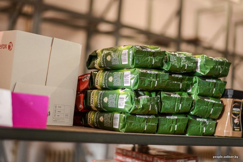 В них столбиками стоят автомобильные шины, в коробках лежат детали, дальше — пачки кофе, вино, порошки, бутылки с отбеливателем, упаковки туалетной бумаги, шоколадки, зонтики.