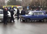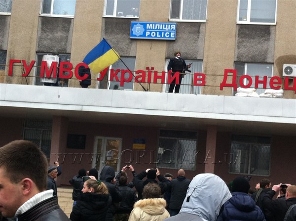 У здания УВД раздаются выстрелы, боевики в масках кричат «Милиция с народом», в это время сотрудники милиции с автоматом охраняют флаг Украины на здании.