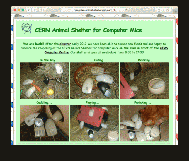 Питомник заметила журналистка Виктория Терк, когда гуглила «милые животные ЦЕРН». На момент написания заметки при таком поисковом запросе чаще выпадают новости о птенце сокола, которого нашли на территории лаборатории. Но среди них можно найти ссылку на пост трехлетней давности на Reddit, в котором рассказывалось о тех самых компьютерных мышах в клетке.