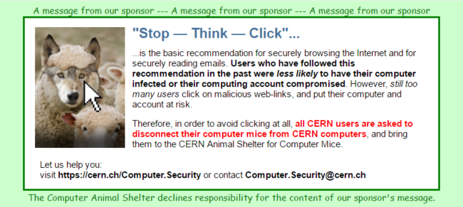 «Одна из самых опасных вещей в компьютерной безопасности — переход по небезопасным ссылкам. Люди видят текст, подчеркнутый голубой линией [то есть ссылку], кликают по нему, и никогда не угадаешь, что там будет», — пояснил Людерс. Идея шутки заключалась в том, чтобы сотрудники ЦЕРН прислали свои мышки в питомник, а сами вводили адреса с помощью клавиатуры.