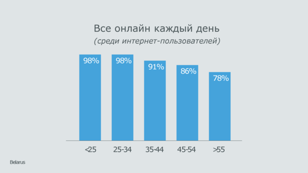 91% белорусских интернет-пользователей ежедневно заходят во Всемирную сеть. При этом среди молодых людей этот процент еще выше — так, среди опрошенных онлайн-юзеров в возрасте до 35 лет ежедневно присутствуют в интернете 98%. Уровень ежедневного использования интернета у белорусов старше 55 лет очень высок — 78%.