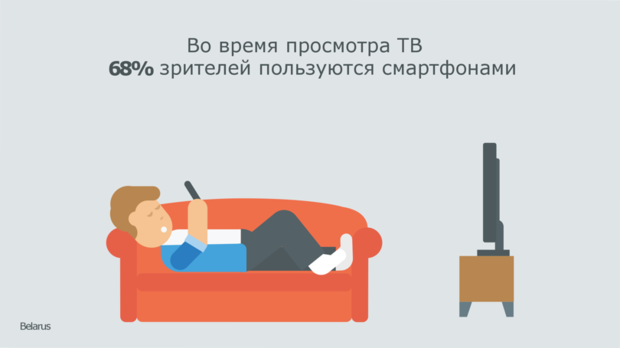 Так, 68% интернет-юзеров пользуются своими смартфонами во время просмотра ТВ, а 50% телезрителей в возрасте до 35 лет заходят онлайн со второго устройства во время просмотра телевизора.