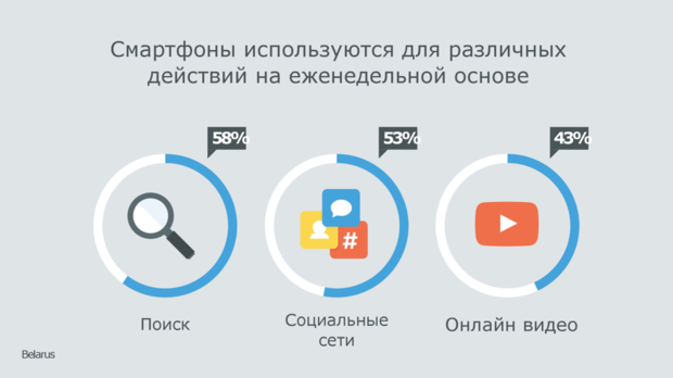 Еженедельно белорусы используют свои смартфоны для: поиска информации — 58%, общения в социальных сетях — 53% и просмотра онлайн-видео — 43%.