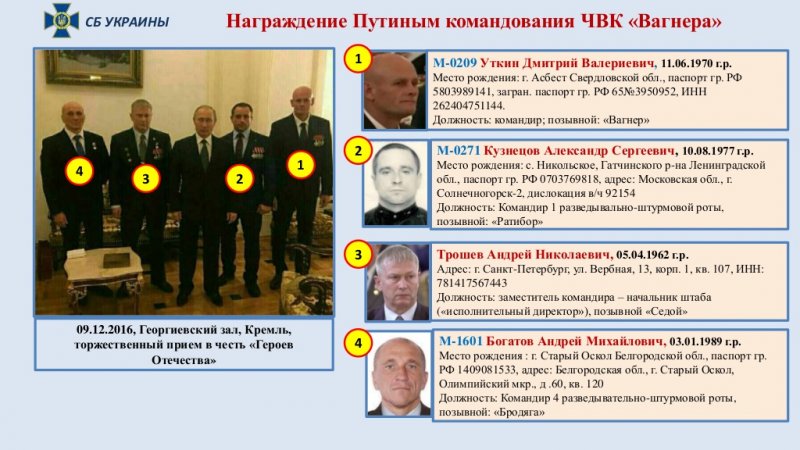 СБУ подготовила подозрение Уткину в совершении тяжких преступлений. Вся информация о наемниках ЧВК передана международным партнерам Украины. "Частная армия Путина может быть использована в любой точке мира", - полагают в украинской спецслужбе, отмечая, что Украина и Сирия - не последние в списке. Москва привыкла имитировать гражданские и развязывать настоящие войны. Так что новая горячая точка - как новое место заработка для наемников ЧВК Вагнера - лишь вопрос времени.