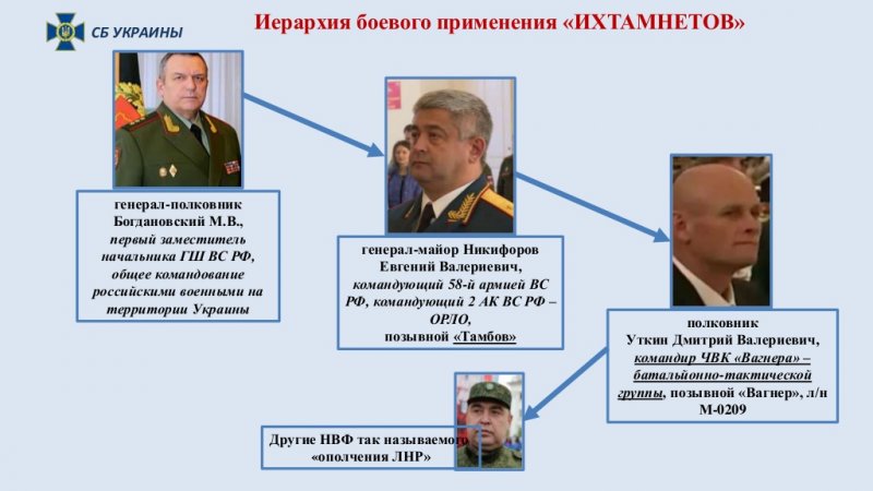 СБУ установила личности 1587 наемников. Управление осуществляется через первого заместителя начальника Генштаба ВС РФ Николая Богдановского. Еще одно звено между Кремлем и Уткиным - генерал-майор РФ Евгений Никифоров, который напрямую руководит Уткиным, утверждают в спецслужбе.