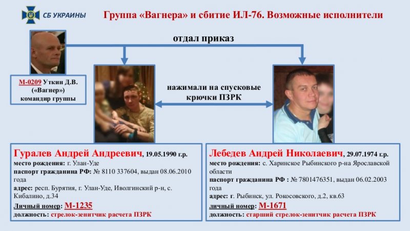 Украинская спецслужба также располагает информацией о боевиках, которые, с большой долей вероятности, непосредственно сбили Ил-76. Это граждане РФ Гуралев Андрей Андреевич и Лебедев Андрей Николаевич.