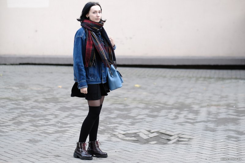 — На нашей героине джинсовая куртка оверсайз в стиле девяностых (или, возможно, прямиком оттуда, что было бы даже интереснее). А это, между прочим, одна из обязательных модных вещей нынешней осенью. Эта куртка плюс грубые ботинки и объемный шарф в опять же модную сейчас клетку надеты с гольфами-ботфортами и девчачьей юбкой — один из любимейших приемов «странного» смешения стилей в уличной моде.