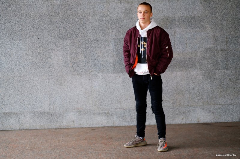 — Покупал их за 100 рублей. Бомбер Pablo — тоже реплика. 170 рублей. Худи Off-White — со вторых рук. Потратил $250. И непонятного происхождения джинсы — 60 рублей.