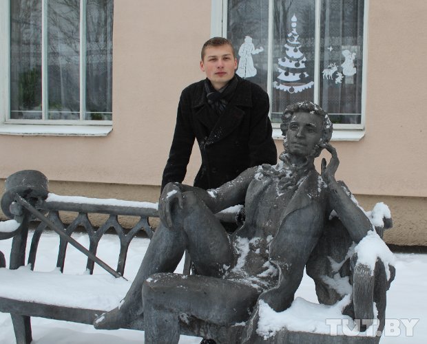 Вернемся к Никите в Новополоцк. Тут есть библиотека имени А.С. Пушкина и памятник поэту. Одна из первых фотографий студента в городе — рядом с памятником. Уверяет, не похож.