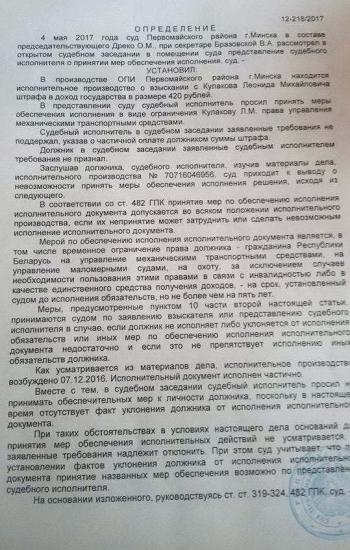 У судзе судовы выканаўца прасіў прыняць захады гарантавання выканання ў выглядзе абмежавання Кулакову Л.М. права кіравання механічнымі транспартнымі сродкамі.