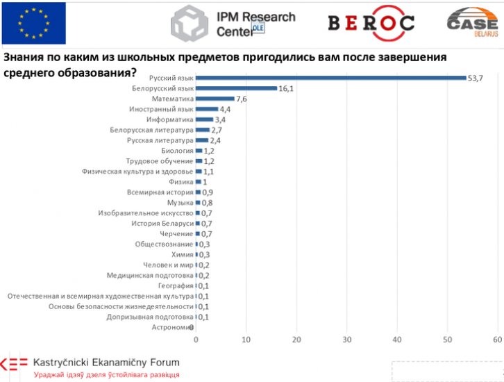 Адказы на пытанне анкеты «веды па якіх з школьных прадметаў спатрэбіліся вам пасля завяршэння сярэдняй адукацыі?» дзівяць. 54% назвала расейскую мову, 16% - беларускую, 7% - матэматыку. Далей - прыкметна горш. Менш за 1% выбралі гісторыю, хімію, геаграфію", - канстатуе Дар'я Урбан. Так ацанілі школьную праграму тыя выпускнікі, хто некалькі гадоў таму скончыў школу, многія паступілі ва ўніверсітэт, некаторыя вучацца не першы год.