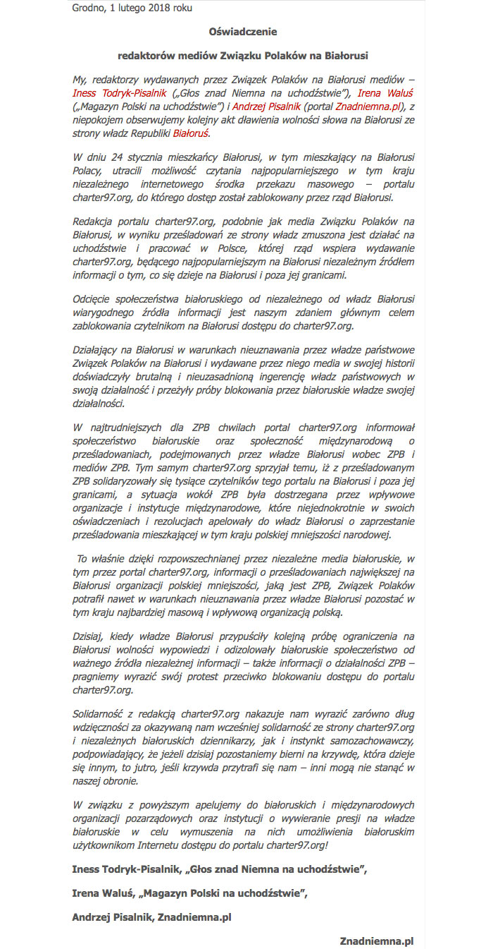 Мы, рэдактары СМІ Саюза палякаў Беларусі - Інэса Тодрык-Пісальнік («Głos znad Niemna na uchodźstwie»), Ірэна Валюсь («Magazyn Polski na uchodźstwie») і Анджэй Пісальнік (portal Znadniemna.pl), з занепакоенасцю назіраем за чарговым актам падаўлення свабоды слова беларускімі ўладамі.