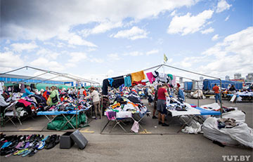 Прылавак са зброяй пад сцягам дзяржавы, якой няма, стаіць каля самага ўваходу на менскі рынак.