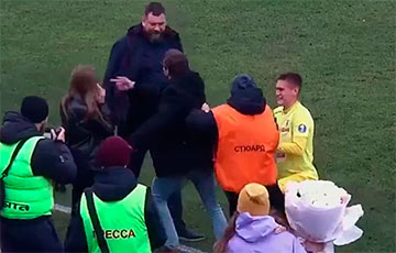 Адказацьколхозный жирный быкан, бывший мент на пенсии выскочил, т.к. увидел, что зрительница бросилась на поле, а его обязанности - предотвращать такое. Футболист оскорбился, обидели его невесту, и сразу дал в морду.