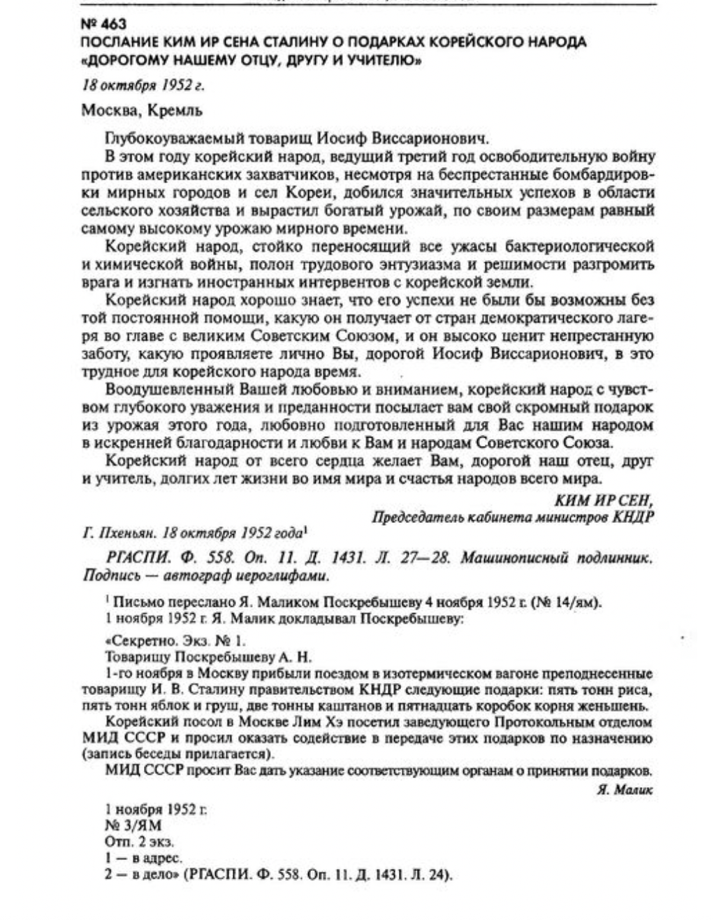 Магчыма, гаворка ідзе пра ліст Кіма Ір Сэна Сталіну ад 18 кастрычніка 1952 года, які знаходзіцца ў адкрытым доступе ў электроннай бібліятэцы Расійскага гістарычнага таварыства.