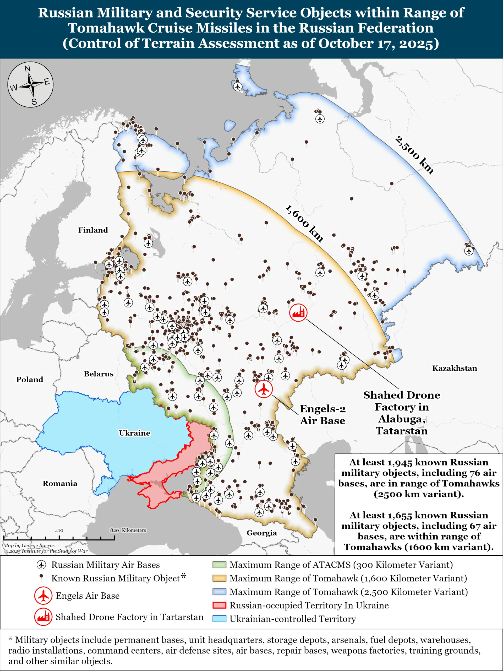 У ISW паказалі, якія расійскія аб'екты могуць трапіць у зону паражэння ракетамі Томагавк