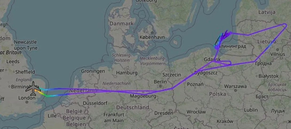 Самалёт вылецеў з Брытаніі раніцай 7 кастрычніка, праляцеў над краінамі Балтыі і зрабіў пятлю над Калінінградам, пасля чаго вярнуўся ў Вялікабрытанію. Пра гэта паведамляе Daily Mail.