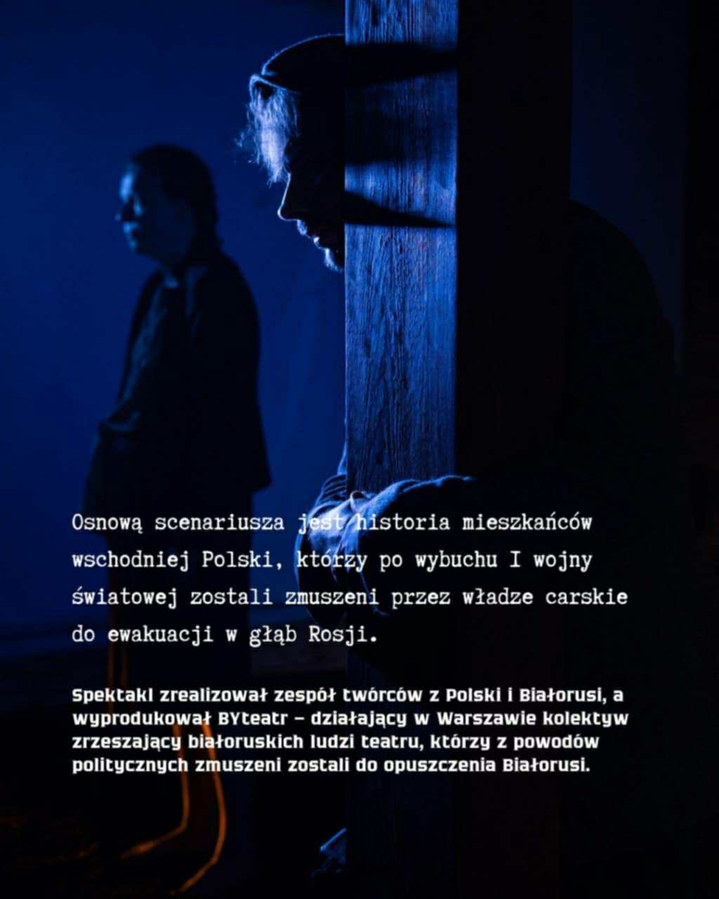 Асновай п'есы, як расказалі сайту Charter97.org арганізатары, з'яўляецца гісторыя жыхароў усходняй Польшчы і Заходняй Беларусі, пераважна праваслаўных этнічных беларусаў, якіх пасля пачатку Першай сусветнай вайны царскія ўлады прымусілі эвакуявацца ўглыб Расіі.
