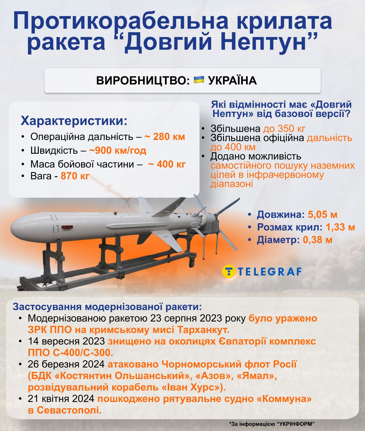 - У цэлым вытворчасць новай ракеты — гэта не проста замена кампанентаў са старой супрацькарабельнай ракеты «Нептун». Фактычна, гэта глыбокая мадэрнізацыя, калі не выраб амаль новага вырабу. Ідзе гаворка пра павелічэнне габарытаў, верагодную замену рухавіка, павелічэнне баявой часткі, а галоўнае — паляпшэнне электронікі і навігацыйнай сістэмы для супрацьдзеяння варожаму РЭБ. На ўсё гэта патрэбны час, і праца ўкраінскіх інжынераў працягвалася; уласна, вось чаму доўга перапрацоўвалі «Нептун», — растлумачыў аналітык.