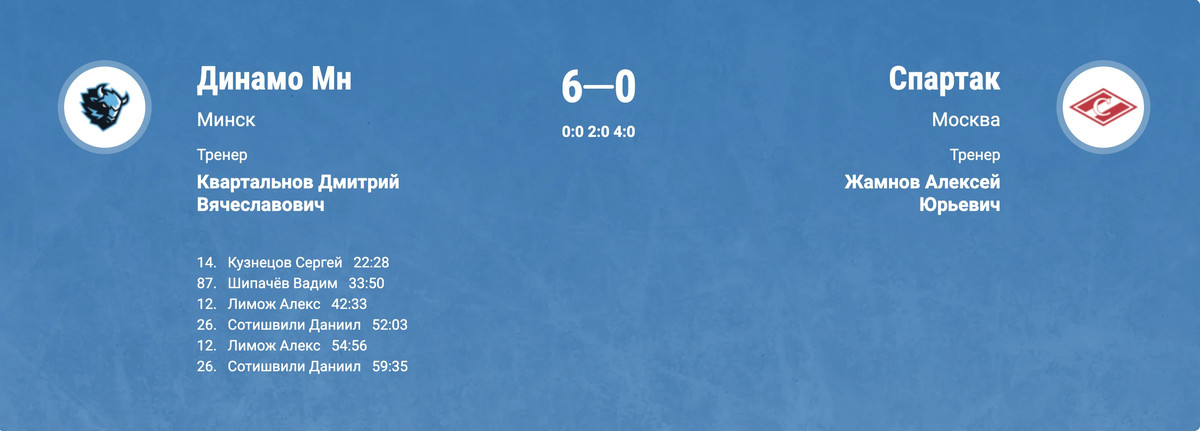 Мінскае «Дынама» зноў перамагае на «Мінск-Арэне» — ужо чацвёрты раз запар — і зноў буйна. На гэты раз абыграны маскоўскі «Спартак», лік — 6:0. Мінчукі двойчы закінулі ў другім перыядзе і чатыры разы — у трэцім.