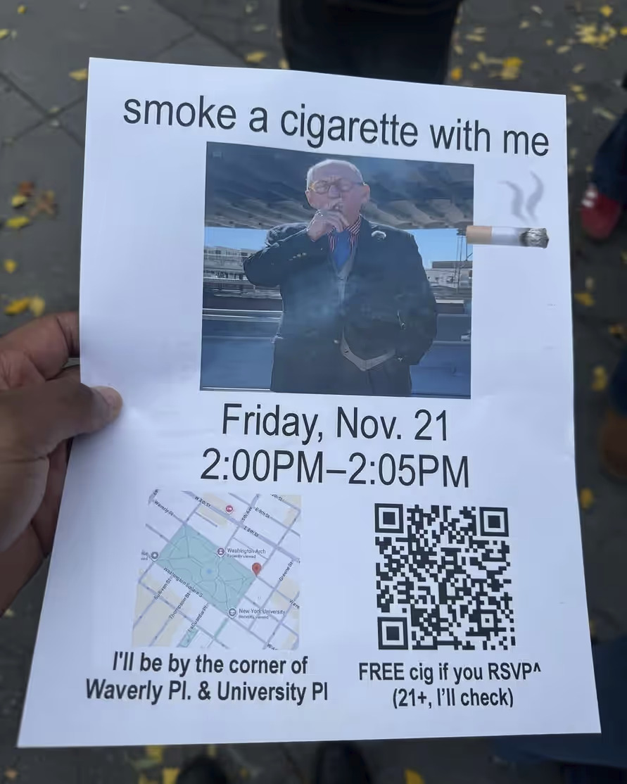 У Нью-Ёрку прайшоў, бадай, самы маштабны арганізаваны перакур у свеце. У пятніцу ўдзень плошча Вашынгтон-сквер сабрала, паводле розных ацэнак, ад 1500 да 2000 курцоў, якія выйшлі на так званую «цыгарэтную вечарынку». Мерапрыемства, якое ахутала парк густым дымам, хутка прыцягнула ўвагу і паліцыі.