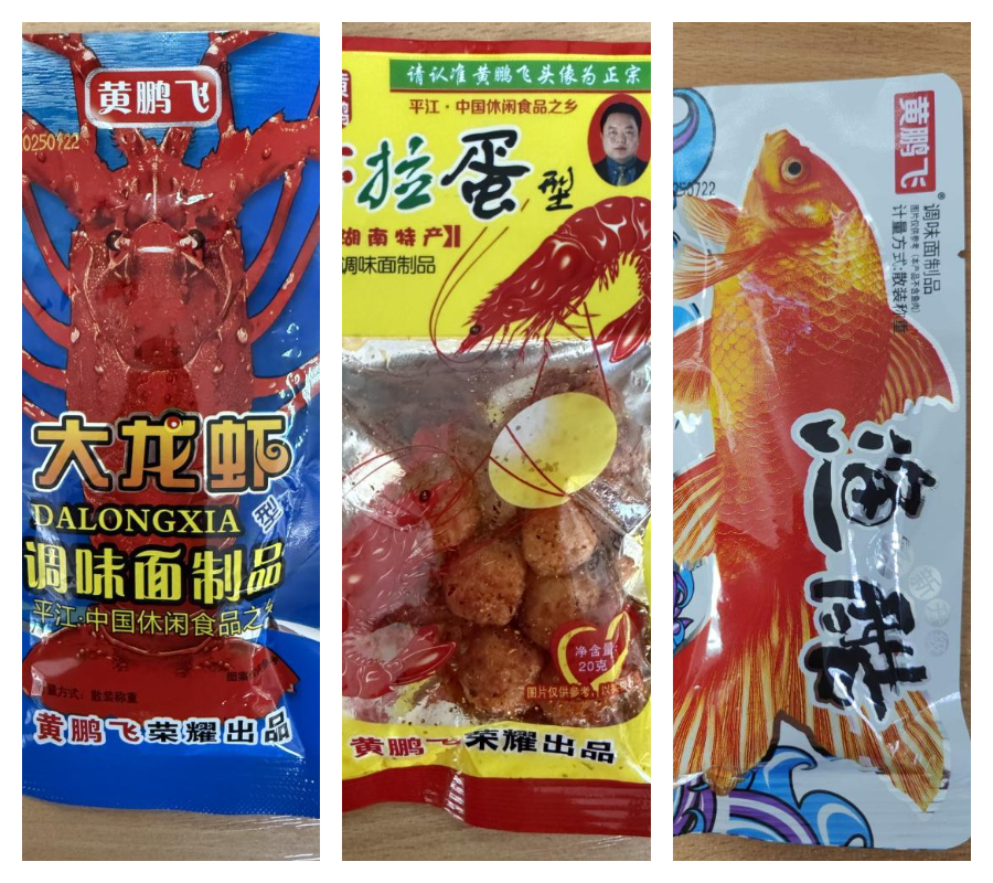 А вось у трох снэках са смакам краба, крэветкі і лобстара ад Huang Peng Fei, акрамя гэтага, таксама выявілі праблемы з маркіроўкай. На ёй не было пазначана, што прадукт утрымлівае цукар або падсалоджвальнікі.