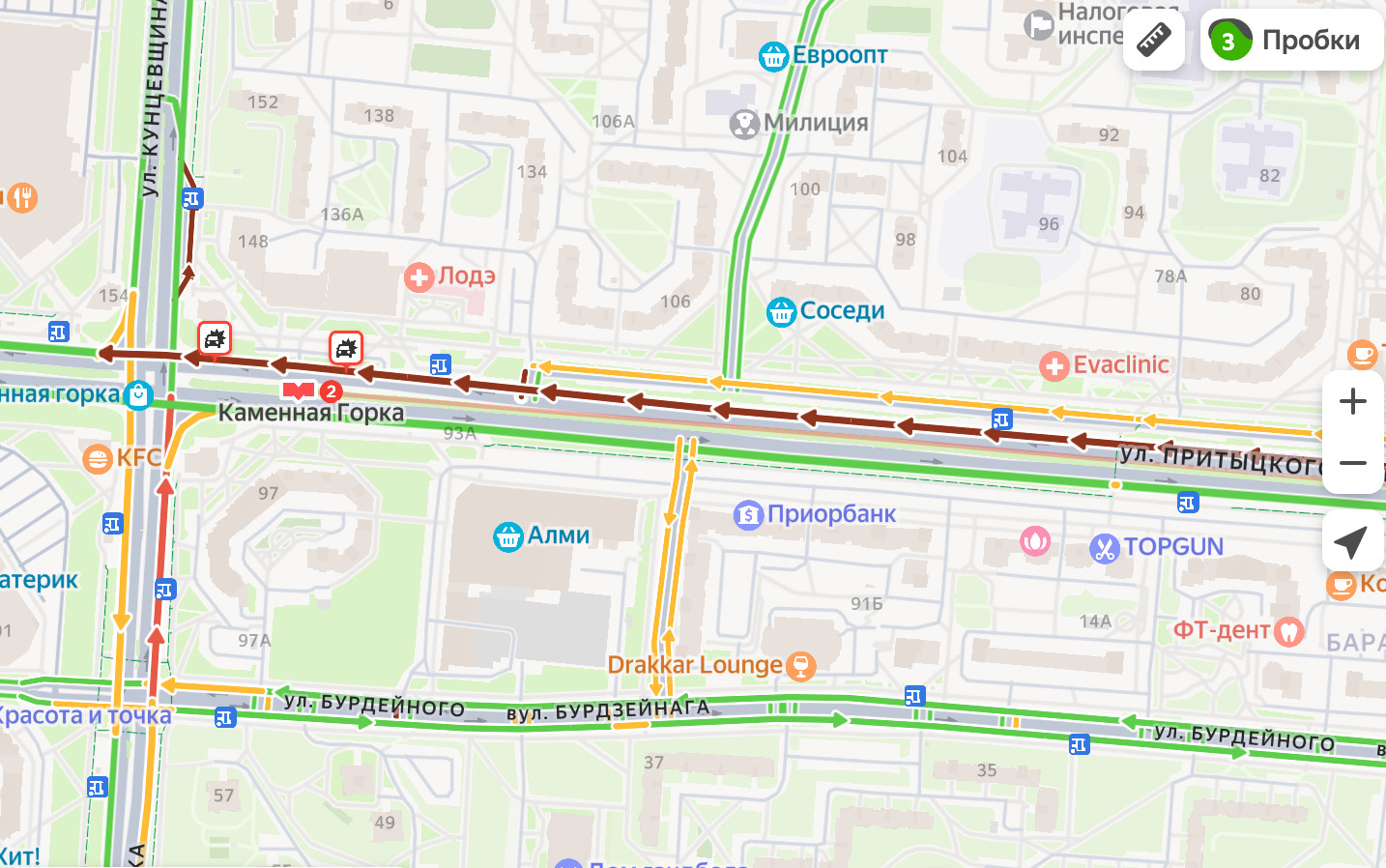 У ДАІ Мінска папярэдзілі, што ўскладнены рух па вуліцы Прытыцкага з боку вуліцы Лешчынскага ў напрамку вуліцы Кунцаўшчыны.