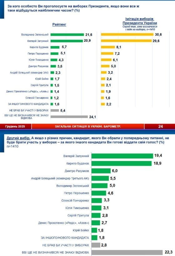 Згодна з даследаваннем, у выпадку правядзення прэзідэнцкіх выбараў у бліжэйшы час у першым туры Уладзіміра Зяленскага падтрымалі б 21,6% рэспандэнтаў, Валерыя Залужнага — 20,9%, а Кірыла Буданава — 5,7%. Менавіта гэтыя кандыдаты дэманструюць найвышэйшыя паказчыкі электаральнай падтрымкі сярод усіх удзельнікаў рэйтынгу.