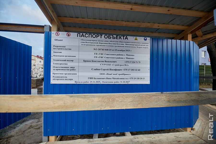 Будоўля ўжо агароджаная плотам, так што пашпарт аб’екта ў наяўнасці. Там пазначана, што будаўніцтва шматкватэрнага дома пачалося 25 лістапада гэтага года, а завяршыць яго мяркуюць у IV квартале 2027 года.
