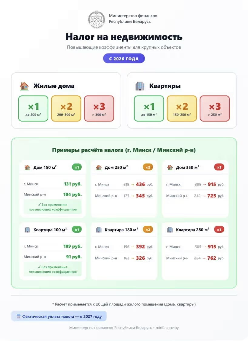 Міністэрства фінансаў наглядна паказала, як для беларусаў павысіцца падатак на нерухомасць пасля змяненняў падатковага заканадаўства ў 2026 годзе. Павышэнне чакае «шчаслівых» уладальнікаў прасторных кватэр і дамоў — павышальныя каэфіцыенты прывязалі да плошчы жылля. Ведамства падзялілася прыблізнымі сумамі на прыкладзе сталіцы і Мінскага раёна — рэгіёнаў з самымі высокімі цэнамі на нерухомасць.