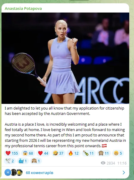 «Рада паведаміць, што мая заява на атрыманне грамадзянства ўхвалена ўрадам Аўстрыі. Аўстрыя — гэта месца, якое я люблю, яна неверагодна гасцінная, там я адчуваю сябе як дома. Мне падабаецца Вена, і я з нецярплівасцю чакаю, калі яна стане маім другім домам. У сувязі з гэтым я з гонарам абвяшчаю, што з 2026 года я буду прадстаўляць сваю новую радзіму, Аўстрыю, у сваёй прафесійнай тэніснай кар'еры», — паведаміла Патапава.