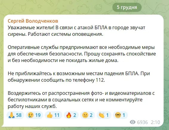 «Паважаныя жыхары! У сувязі з атакай БПЛА ў горадзе гучаць сірэны. Працуюць сістэмы апавяшчэння. Аператыўныя службы прымаюць усе неабходныя меры для забеспячэння бяспекі. Прашу захоўваць спакой і без патрэбы не пакідаць жылыя дамы», — напісаў чыноўнік.