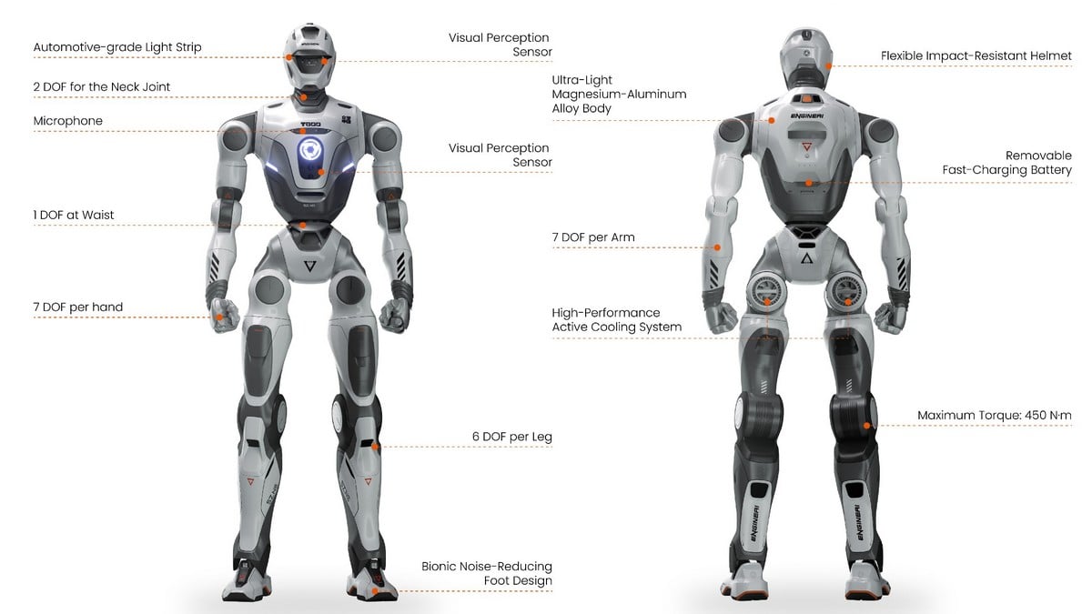 Мадэль T800, прадстаўленая EngineAI на пачатку снежня, уяўляе сабой гуманоіднага робата вышынёй 1,73 м з корпусам з магніева-алюмініевага сплаву. Канструкцыя прадугледжвае 29 ступеняў свабоды ў асноўных суставах і па 7 ступеняў свабоды на кожную руку. Маса робата складае 75 кг. У залежнасці ад канфігурацыі T800 абыдзецца ад $25 тыс. да $50 тыс.