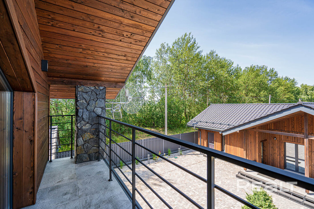 Дом построен в деревне Буда в 15 км от Минска. Фундамент тут монолитный, наружные стены возводили из керамзитобетонных блоков с утеплителем. Дополнительно фасад отделан декоративным планкеном (лиственница), а вот цоколь и часть стен облицованы песчаником. На крышу положили керамическую черепицу. Площадь дома — 200 квадратов.