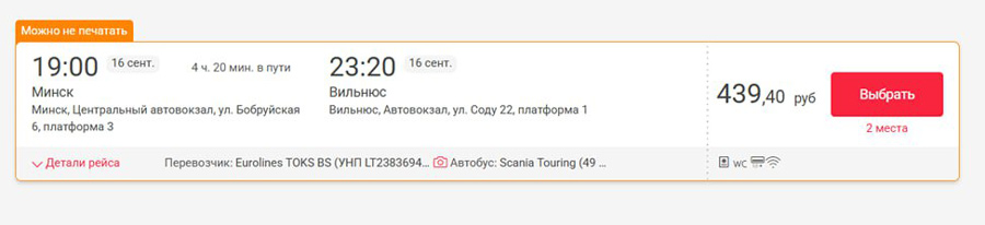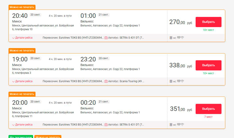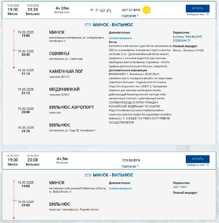Так, на сайце кампаніі Intercars кошт квіткоў з Мінска ў Вільнюс стаў на ўзроўні Br220–270. Пры гэтым на некаторыя даты, напрыклад на 19 верасня, ёсць і ўвогуле квіткі па Br429–729.