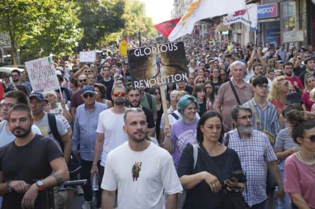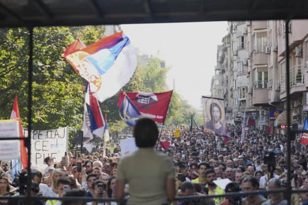 Тысячы студэнтаў-пратэстоўцаў выкрыквалі лозунгі супраць прэзідэнта Сербіі Аляксандара Вучыча на мітынгу ў цэнтры Бялграда ў панядзелак, 8 верасня, абвінавачваючы паліцыю ў жорсткасці падчас нядаўніх антыўрадавых дэманстрацый.