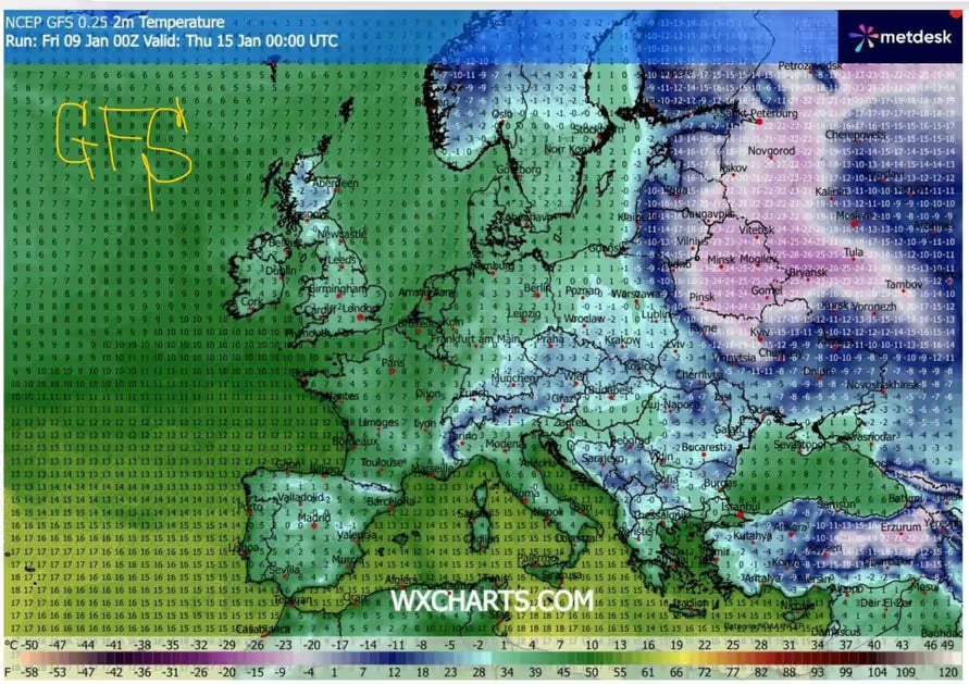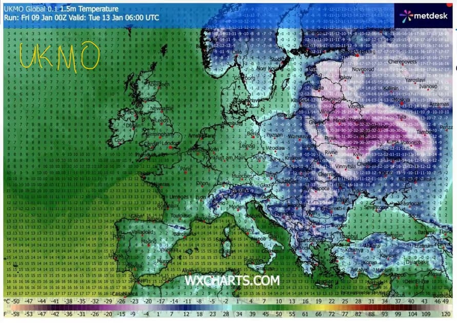 Так, лікавая мадэль GFS прагназуе моцныя маразы да −22…−25° на наступны чацвер, 15 студзеня, а найбольш люты сцэнар — у англійскай UKMO. Паводле версіі брытанскіх сіноптыкаў, з 13 студзеня тэмпература паветра ў Беларусі будзе трымацца ў дыяпазоне ад −25 да −30°С, а на паўднёва-ўсходзе Беларусі — аж да −34°С.