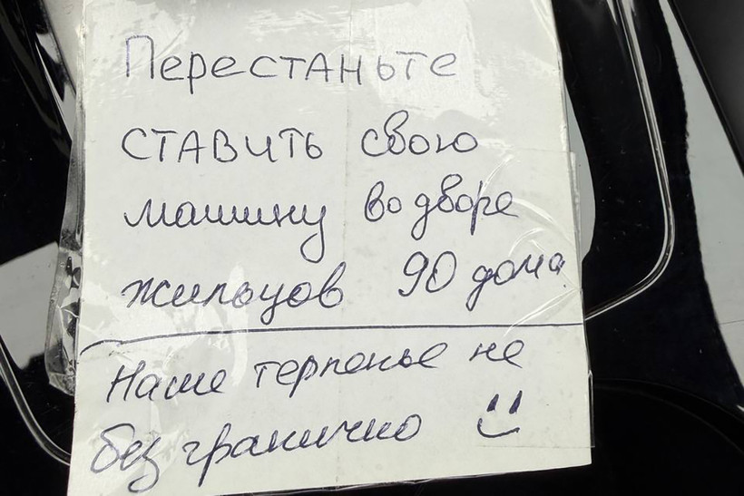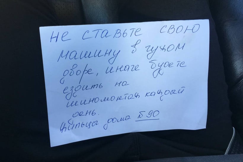 У рэдакцыю onliner.by звярнулася мінчанка Ганна: нядаўна яна атрымала запіску ад сваіх суседзяў. Невядомы аўтар абяцае, што дзяўчыне давядзецца кожны дзень ездзіць на шынамантаж, калі яна будзе працягваць паркаваць аўтамабіль не каля свайго дома (а на адлегласці адной зялёнай зоны ад яго).