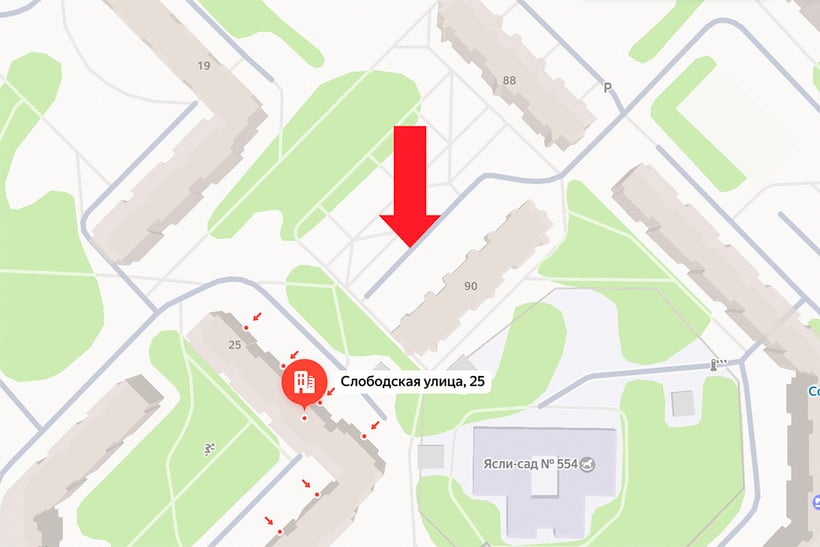 Стрэлка паказвае на месца, дзе дзяўчына пакідае аўтамабіль, калі ў яе двары няма магчымасці прыпаркавацца. Па сутнасці, гэта розныя двары: скразнога праезду з аднаго ў другі няма. Але фактычна свой аўтамабіль, пакінуты каля дома №90, дзяўчына можа бачыць з акна.