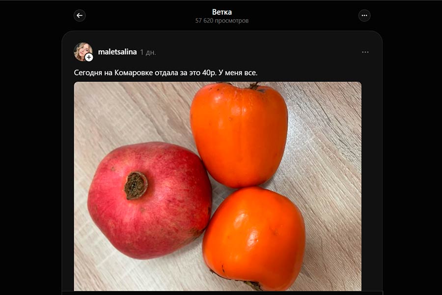 Іншая каментатарка адзначыла, што за дзве хурмы аддала ўсяго Br5. Яшчэ адна карыстальніца Threads пахвалілася, што ў пачатку сезона на Табарах купіла скрыню хурмы.
