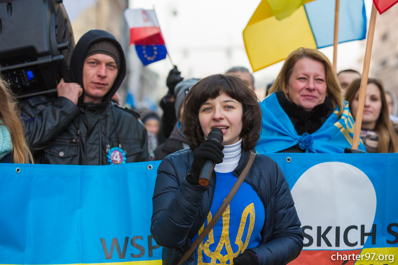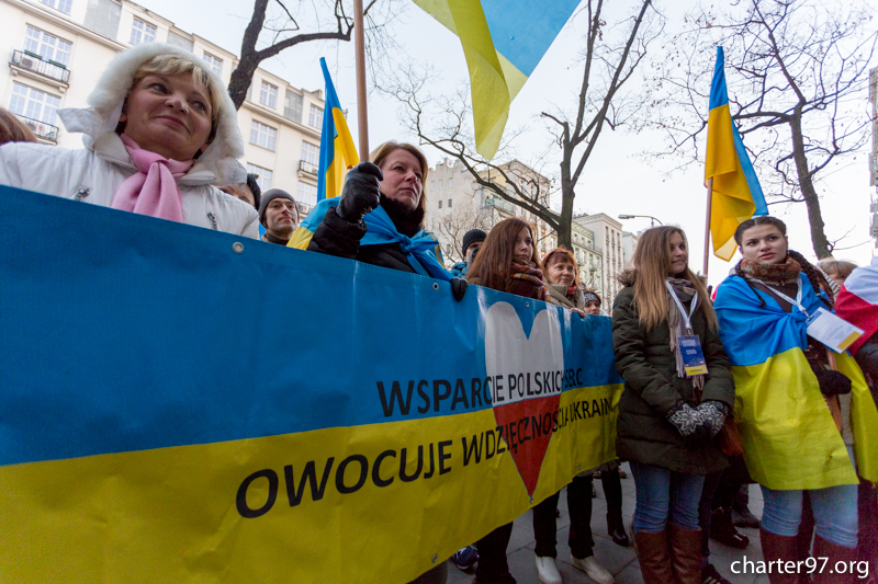 As charter97.org is informed, the march started at Castle Square in Warsaw. Its participants went to the Ukrainian Embassy where they took one minute’s silence in remembrance of Euromaidan victims and victims in Donbas. Ukrainian, Polish and Belarusian activists spoke in front of the crowd.