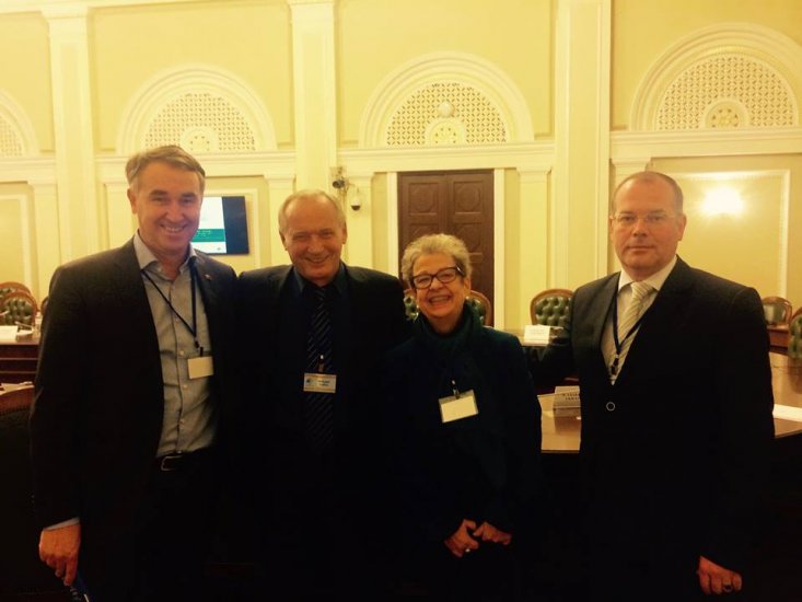 "Kiev. The Verkhovna Rada of Ukraine. The Euronest Parliamentary Assembly. The meeting of the working group on Belarus. A discussion of the EU-Belarus dialogue results. I talk about the trial of Belsat TV channel journalists. About Mikalai Statkevich’s arrest. About the intensification of repression in Belarus in general. About the fact that only the regime benefits from the "dialogue" of the EU. U. Misev, head of the EU delegation in Belarus A. Victorin, director of the Eastern Neighborhood Department L. Meradit, and director of the International Center for Army Studies M. Samus, as it seems to me, listen attentively."
