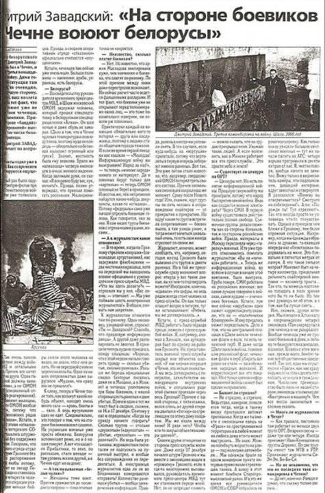 In 1994-1997, Zavadski worked in the Aliaksandr Lukashenka's pool of camera operators, then he left for Russian Public Television (now the Channel One Russia). In the spring of 1997, Dzmitry, together with ORT reporter Pavel Sheremet, was arrested and charged with illegal crossing of the Belarusian-Lithuanian border while filming the report. He put on probation for a year and a half. From October 1999 to May 2000, Zavadski worked in Chechnya, where he, together with Sheremet, filmed the Chechen Diary documentary.