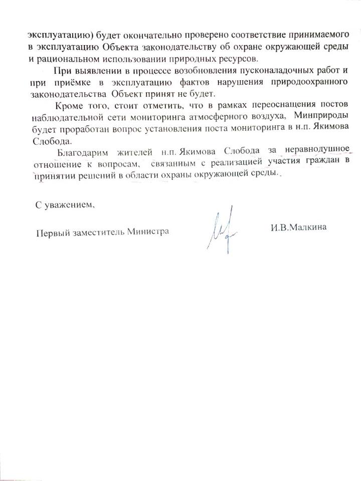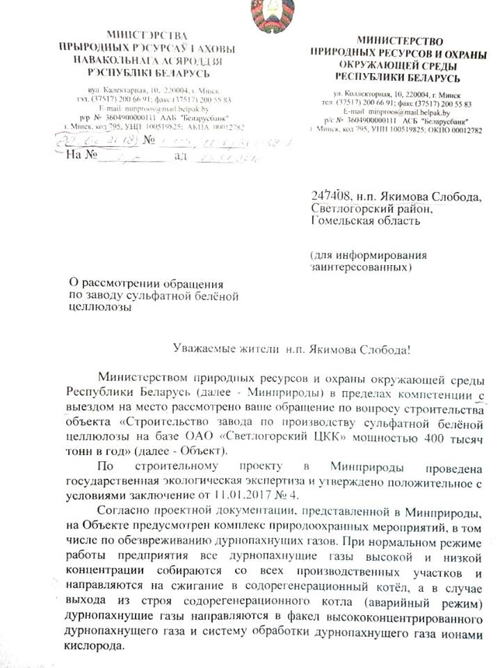 "Commissioning works are suspended on the bleached pulp plant, corrrective measures are being taken," it was the response of the Ministry of Natural Resources to complaints of residents of Yakimova Sloboda village.