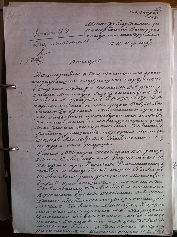 Lapatsik wrote: “I am reporting that in April 1999, Sheiman gave Paulichenka the command to physically destroy former Interior Minister Zakharanka. Further, in September, Paulichenka held an action to capture and destroy Hanchar and Krasouski. ” Navumau’s resolution of November 21, 2000 was “For Execution”. That is, Navumau ordered Lapatsik to do something, but what exactly is unknown.