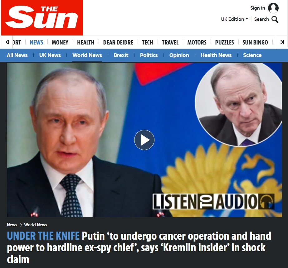 It is claimed that Putin has Parkinson's disease and schizoaffective disorder. Security Council Secretary Nikolai Patrushev will be in charge of Russia during his absence, the British newspaper The Sun writes.